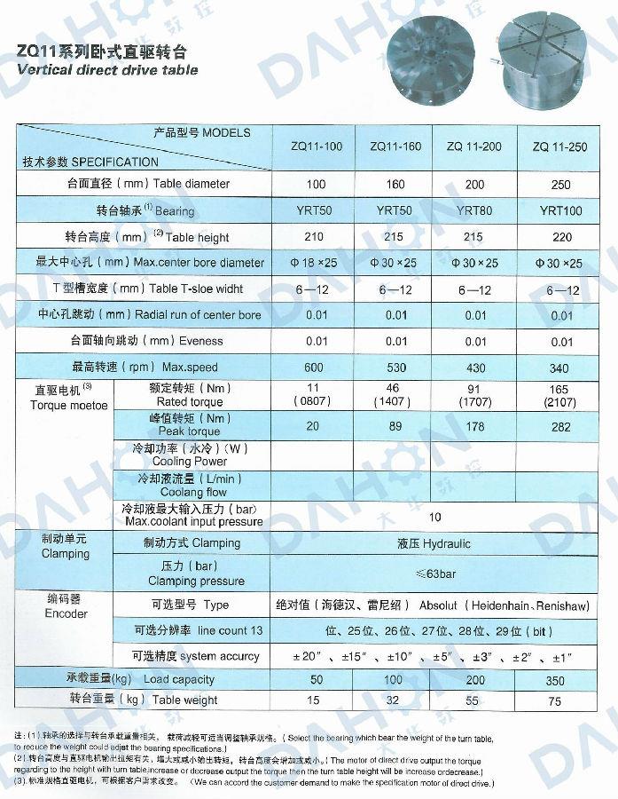 ZQ系列數控直驅回轉工作臺采用大扭矩力矩電機直接驅動,編碼器為反饋信號,可實現高精度的旋轉定位,是數控鏜銑床和加工中心的理想配套附件。工作時,在主機相關控制系統控制下,能夠完成與主機相協調的各種必需的分度回轉運動,實現等分、不等分的連續孔、槽、曲面的加工,且達到較高的精度。煙臺大華數控機床附件有限公司是數控機床附件設備的知名配套企業,可生產多種型號臥式直驅轉臺產品,技術精湛,可定制研發。
